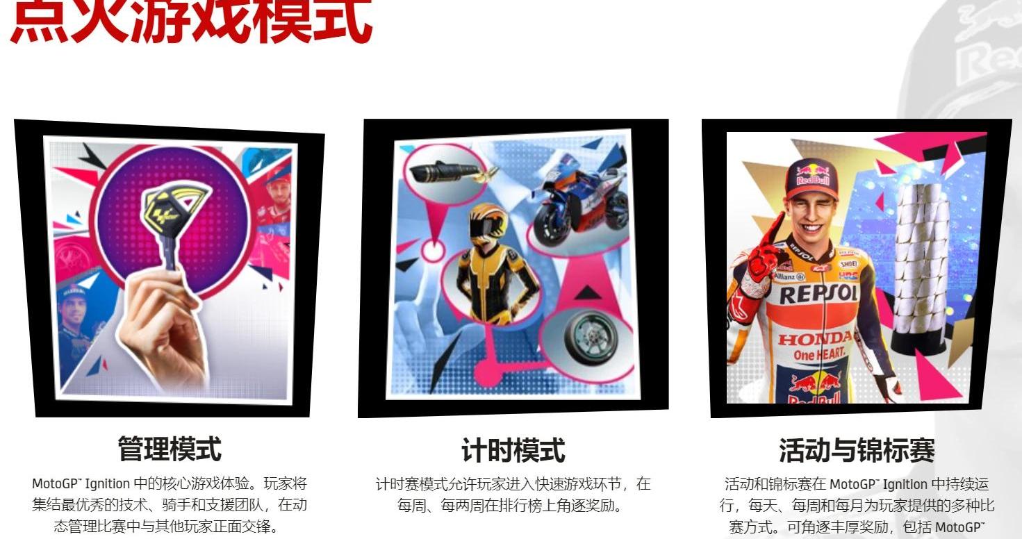MotoGPIgnition游戲卡牌競技玩法上,MotoGPIgnition未來將主打“點火游戲”模式,包含3種玩法。第一是管理模式,也是游戲中的核心體驗。玩家將集結最游戲的技術、車手和支援團隊,在動態管理比賽中與其他玩家正面交鋒;第二是計時模式,允許玩家進入快速游戲環節,每周或每兩周在排行榜上角逐獎勵;第三是持續不斷舉行的活動與錦標賽,會在每天、每周和每月為玩家提供多種比賽方式,可角逐豐厚獎勵,獲取優質裝備的車手,性能將大有提升。