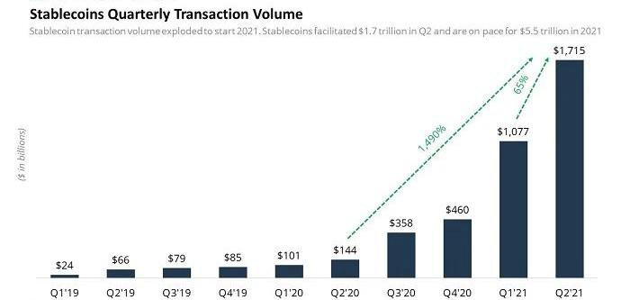 2021年第二季度,穩定幣總發行量超過1070億美元,自第一季度以來增長了70%,同比增長了803%。