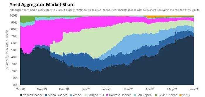 在收益聚合器市場上,二季度值得關注是Yearn的卷土重來和上升,其市場份額在本季度從29%飆升至69%。