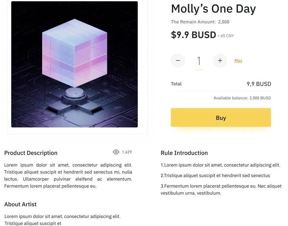 1.誰有資格在BinanceNFT市場上鑄造NFT?目前只有獲得授權的創作者才能直接鑄造NFT。不過未來該功能將向所有注冊用戶開放。2.綁定區塊鏈將在哪個區塊鏈上鑄造NFT?鑄造的NFT將存在于BSC上,未來將支持多個區塊鏈。3.鑄造費是多少?BSC上每個NFT的鑄造費用為0.005BNB。4.接受哪些文件格式,以及最大上傳大小是多少?圖片:JPEG、PNG、SVG和GIF視頻:MP4、MPEG和AVI音頻:WAV和MP3文件:PDF所有文件都應小于50MB。5.我可以在它正在鑄造時取消創建嗎?一旦支付了費用,鑄造就會開始而且無法被中止。由于創建NFT是鏈上行為,所以團隊無法刪除或更改已添加至區塊鏈上的信息。6.NFT的內容存儲在哪里?幣安會把這些內容存儲在一個中心化的服務器中,這些內容并未上鏈,但是與其相關聯的NFT作品是在鏈上的。7.已鑄造的NFT能被修改嗎?一旦被鑄造就不能修改了,但是可以把鑄造好的NFT刪除并用相同的文件鑄造一個新的NFT。購買