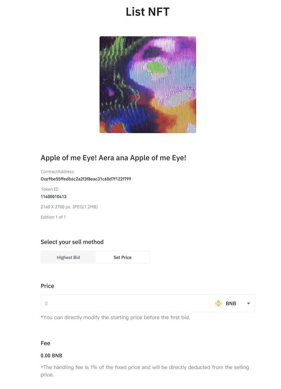 在平臺上出售NFT作品同樣可以選擇以固定價格出售或者以拍賣的形式出售。將已有NFT作品導入平臺或者直接在平臺上完成鑄造的NFT創建者可在該作品的每筆交易中獲得1%的分成。如何在幣安NFT市場上出售NFT首先需要確認出售的形式和時長并提交信息,平臺審查完成后該作品即可按照出售者的意愿上架。成功創建NFT后,您將看到「鑄造完成」屏幕。單擊「ListNFT」按鈕,即可上架鑄造好的NFT作品。