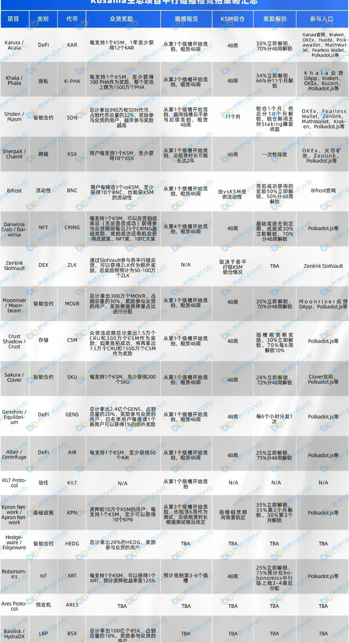 各項目方Kusama平行鏈插槽競拍和眾貸情況Karura|Acala先行網絡代幣:KAR何時開始競拍:第1個插槽插槽租賃時長:48周眾貸獎勵規則:用戶每支持1個KSM,1年將得到12個KAR作為獎勵。另外有10%的額外KAR分配給邀請用戶參與的用戶和被邀請用戶。KSM鎖倉情況:48周獎勵如何解鎖:30%立即解鎖,70%分48周解鎖參與入口:Karura官網、Kraken、OKEx、Huobi、Polkawallet、MathWallet、FearlessWallet、Polkadot.js等項目介紹:Karura是Kusama網絡中的DeFiHub,提供一系列基礎設施,包括質押衍生品LKSM、基于多種抵押品的穩定幣kUSD、自動做市平臺KaruraDEX等。Khala|Phala先行網絡代幣:Khala不會發行自己的網絡代幣,而是會沿用Phala的PHA,這個代幣在Khala上叫K-PHA,K-PHA和PHA可以1:1兌換何時開始競拍:第2個插槽插槽租賃時長:48周眾貸獎勵規則:用戶每支持1個KSM,將得到100個K-PHA作為獎勵。邀請新用戶參與,邀請方和被邀請方都可以獲得額外的0.5%獎勵。此外獎池設有1500萬個K-PHA的上限,先到先得。KSM鎖倉情況:48周獎勵如何解鎖:34%立即解鎖,66%分11個月解鎖參與入口:Khala眾貸DApp、Kraken、OKEx、Kucoin、Polkadot.js等項目介紹:Khala是Kusama網絡中的隱私平行鏈。其在波卡網絡中的平行鏈Phala將為波卡上的平行鏈、DeFi、DApp等提供CPU隱私算力。Shiden|Plasm先行網絡代幣:SDN何時開始競拍:第1個插槽,贏得插槽后就不會參與后續輪次的競拍插槽租賃時長:48周眾貸獎勵規則:總計拿出990萬枚SDN代幣,占到代幣總量的22%,獎勵參與眾貸的用戶。其中20%根據一定的規則分發,越早參與獎勵越高。2%作為獎金。KSM鎖倉情況:48周獎勵如何解鎖:鎖倉1個月,之后分10個月線性釋放,鎖倉期間支持Staking賺取收益參與入口:OKEx,FearlessWallet,Zenlink,MathWallet,Kraken,Polkadot.js等項目介紹:Kusama中繼鏈在設計上不支持智能合約功能,但是Kusama是需要運行智能合約的,這就是Shiden的作用。Shiden從一開始就支持以太坊虛擬機、WebAssembly和Layer2解決方案。該平臺支持各種應用程序,如DeFi、NFT等。SherpaX|ChainX先行網絡代幣:KSX何時開始競拍:第1個插槽插槽租賃時長:總租賃時長可能長達2年眾貸獎勵規則:用戶每支持1個KSM,將得到10個KSX作為獎勵。還將根據用戶的鎖倉量,是否參與邀請活動等提供獎勵。KSM鎖倉情況:48周獎勵如何解鎖:一次性釋放參與入口:OKEx、火幣礦池、Zenlink、Polkadot.js等項目介紹:SherpaX在波卡上的平行鏈ChainX致力于比特幣Layer2擴張、數字資產網關、波卡Layer2中繼鏈,以實現跨鏈資產交易并引導比特幣跨鏈DeFi的新方向。SherpaX成為Kusama平行鏈后的主要實驗方向是將ChainX的XBTC跨鏈到SherpaX,SherpaX上的XBTC通過鏡像模擬的方式發行其他合成資產。上線比特幣期貨、期權等衍生品,形成比特幣最大的Layer2金融衍生平臺。Bifrost代幣:BNC何時開始競拍:第1個插槽插槽租賃時長:48周眾貸獎勵規則:用戶每鑄造1個vsKSM,將得到至少10個BNC作為獎勵。獎勵包括將KSM鑄造為vsKSM時獲得的BNC、參與邀請活動獲得的BNC,以及競拍成功后獲得的BNC。用戶也將獲得KSM的流動性。KSM鎖倉情況:插槽競拍成功后,vsKSM和vsBond即可流通,租賃期結束后,vsKSM+vsBond可以1:1兌換為KSM獎勵如何解鎖:競拍成功獲得的獎勵50%立即解鎖,50%分48周線性解鎖參與入口:Bifrost官網等項目介紹:Bifrost是波卡和Kusama上為Staking提供流動性的平行鏈,用戶可以隨時將PoS幣種通過Bifrost轉接橋兌換成vToken,通過vToken獲得Staking收益和流動性。DarwiniaCrab|Darwinia先行網絡代幣:CRING何時開始競拍:第4個插槽插槽租賃時長:48周眾貸獎勵規則:用戶每支持1個KSM,可以在競拍結束后獲得參與眾貸期間每日25個CRING的基礎獎勵。如果競拍成功,還有機會根據質押量等獲得成就獎、NFT獎,和1BTC大獎。KSM鎖倉情況:48周獎勵如何解鎖:基礎獎勵無鎖定期,成就獎30%立即解鎖,70%分48周解鎖參與入口:Polkadot.js等項目介紹:DarwiniaCrab是Kusama生態系統中支持跨鏈、智能合約、NFT的一條平行鏈。Crab提供智能合約解決方案,所以能夠支持DeFi、NFT等DApp。Crab提供跨鏈互操作性,所以能為以太坊、BSC等公鏈項目提供進入Kusama的入口。Crab比較大的特色應該就是集成NFT、盲盒、GameFi、挖礦等玩法。ZenlinkSlotVault代幣:ZLK眾貸獎勵規則:Zenlink本身并不參與平行鏈插槽拍賣,但是其為用戶參與各平行鏈眾貸活動提供了一個名為SlotVault的類機槍池平臺,可以比較清晰地看到各眾貸方案在不同時期的收益情況。所有通過SlotVault參與眾貸的用戶可以獲得ZLK作為額外獎勵,總獎勵額預計為50-100萬個ZLK。KSM鎖倉情況:取決于各平行鏈KSM鎖倉情況獎勵如何解鎖:TBA,可能會有一小部分獎勵有短時間的鎖倉參與入口:SlotVault項目介紹:Zenlink是波卡生態中的跨鏈去中心化交易網絡,致力于構建新一代跨鏈DEX。通過集成相應模塊,Zenlink可以讓平行鏈擁有DEX能力,并與其他平行鏈共享流動性。Zenlink的DEX聚合器可以鏈接波卡上的所有DEX,讓用戶進行快速、低滑點資產兌換。Moonriver|Moonbeam先行網絡代幣:MOVR何時開始競拍:第1個插槽插槽租賃時長:48周眾貸獎勵規則:總計拿出300萬個MOVR,占到總量的30%,獎勵參與眾貸的用戶。根據質押量占比分配獎勵。KSM鎖倉情況:48周獎勵如何解鎖:30%立即解鎖,70%分48周解鎖參與入口:Moonriver眾貸DApp、Polkadot.js等項目介紹:Moonriver在波卡上的平行鏈Moonbeam是一條兼容以太坊智能合約的平行鏈,致力于打造多鏈未來。CrustShadow|Crust先行網絡代幣:CSM何時開始競拍:第1個插槽插槽租賃時長:48周眾貸獎勵