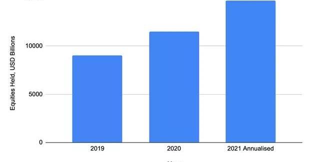 資料來源:世界銀行中國、德國和日本將通過為美國消費者生產小玩意兒來賺取美金,而美國消費者則因他們的支票而大肆消費。日本和中國也分別是美國國債的第一和第二大持有者。他們賺取最多的美元,因此持有最多的美國國債。為了保持他們的國債存量,他們需要購買一組不同的美元資產,這些資產不會因通貨膨脹的政府政策而明顯貶值。美國股市,特別是后COVID行為的受益者科技股在2020年吹響了大門。外國人沒有購買債券,而是變得聰明并大量進入股票市場。