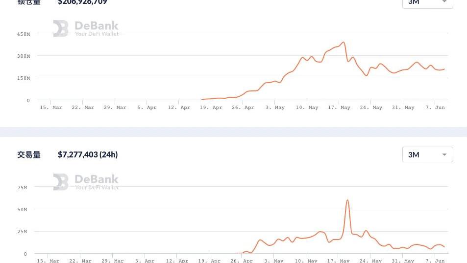 從趨勢上可以看出,自五月中旬起,PancakeSwap應用內的鎖倉量、交易量均有一定下滑。數據顯示,PancakeSwap當前的總鎖倉量為77.8億美元,24小時內,交易量為5.29億美元,交易筆數為95萬筆,用戶數量為25萬人,合約交互次數為319萬次。4.FantomFantom生態內的龍頭DeFi項目SpookySwap可能并不太為人熟知,與Raydium和PancakeSwap一樣,這也是一個AMM型DEX。值得一提的是,在數據表現上,SpookySwap目前的成績較已集成Fantom生態的Sushiswap有著較明顯優勢,這在一定程度上也算是SpookySwap的實力證明了。