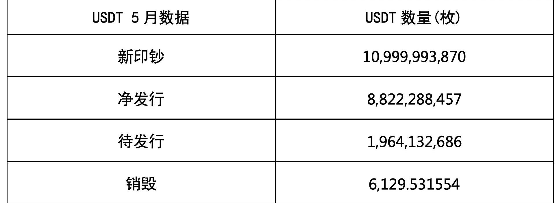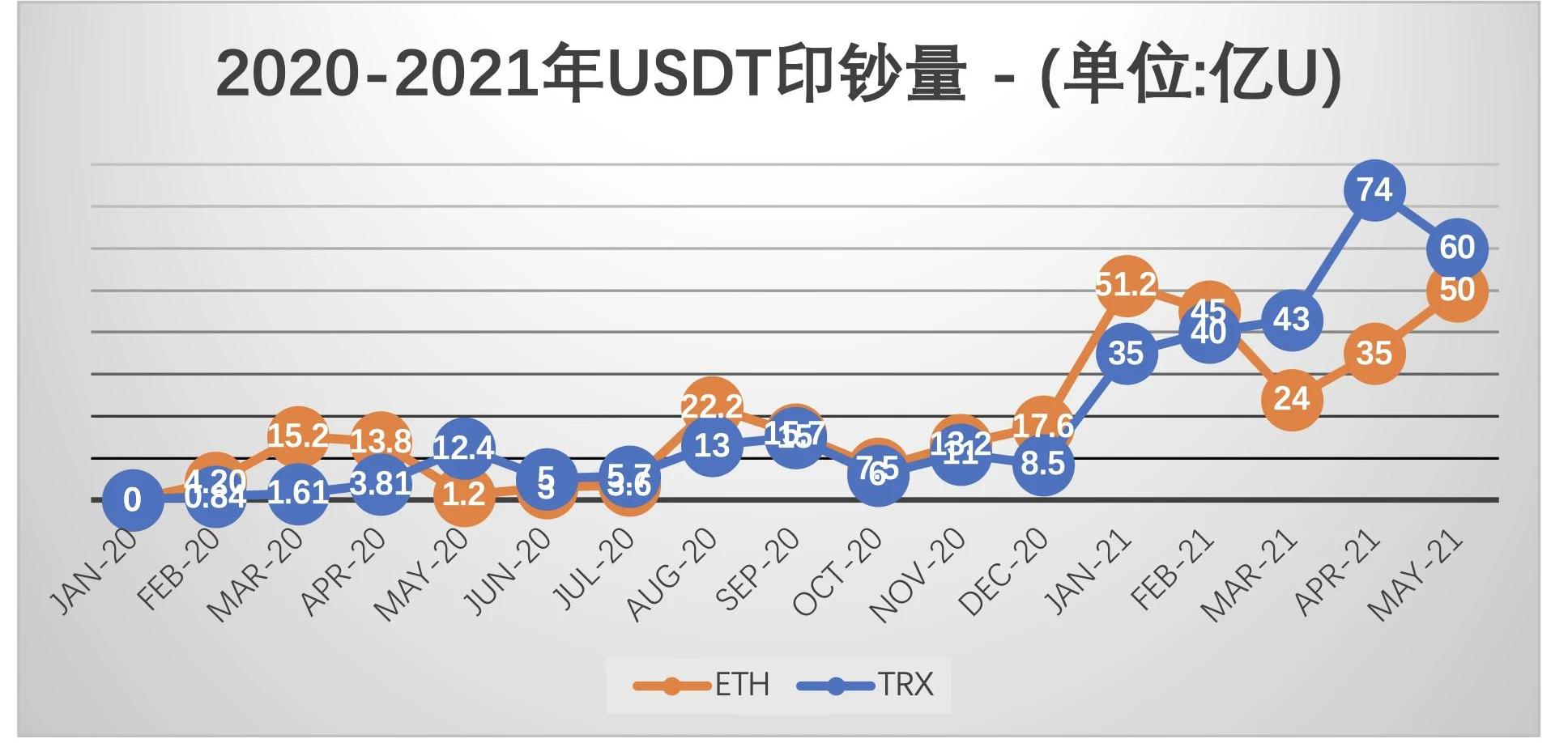 5月USDT凈印鈔共計110億枚,其中ETH印鈔50億枚,TRX印鈔60億枚。