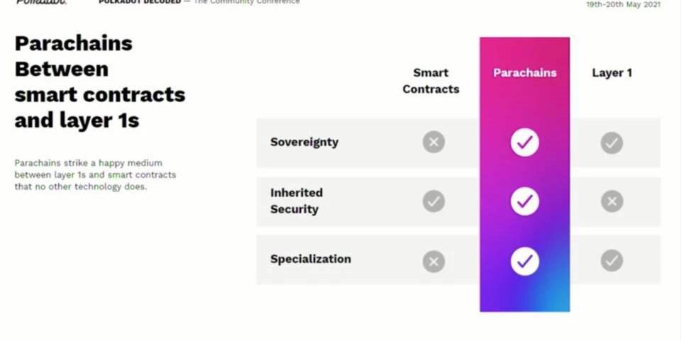 主要是由于平行鏈提高了溝通的方便程度。Layer1的區塊鏈無法很有效地互相橋接,雖然可以橋接,但是最后也會有兩套共識系統和兩套驗證人集。而且,向某一條鏈證明另一條鏈確認了一個區塊、接受了一筆交易,是一件很龐雜的事情,通常會涉及滯后和延遲。所以說關于平行鏈,很有趣的一點是,這些平行鏈都是由同樣的一套共識流程來保證其安全的,所以消息幾乎可以在瞬間在平行鏈之間傳遞,大概在1-2個區塊的時間內,這在區塊鏈世界中算是非常非常快的了。另一點是,當你構建一條平行鏈的時候,由于這條平行鏈是波卡共識系統的一部分,你不用召集自己的驗證人集或者礦工集,來保證你的安全性。你不用收集數十億美元來負責安全性,從而確保你的鏈不會被收購或遭遇51%攻擊。這一點對于那些有創新的想法,卻不一定有能力去做到經濟安全的團隊來說是一個不錯的優勢。平行鏈是一種技術