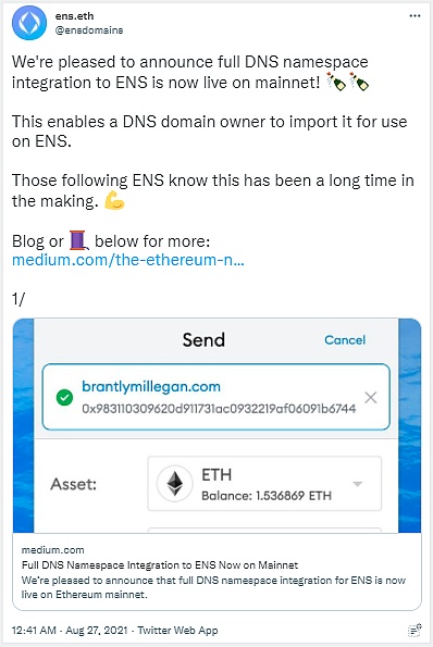 推文:https://twitter.com/ensdomains/status/1430933399745798155?s=20