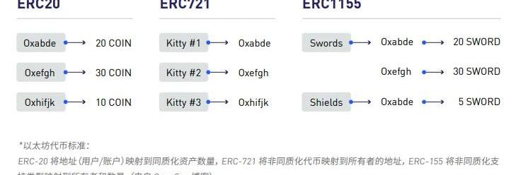 圖片來源:《邊界》NFT行業報告就底層基建而言,市場占比項上以太坊仍保持較大領先優勢,其余公鏈在發展速度及部分指標中擁有不對稱競爭優勢。例如,基于Flow的NBATopShots自2020年8月上線,半年內憑逾4,000萬美元銷售額位列NFT生態銷售額第一DApp,并持續保持其領先地位,WAX則借AlienWorlds游戲DApp在錢包活躍度指標項上處于領先地位。NFT底層基建之一Solana與去中心化存儲平臺Arweave現已通過SOLARBridge橋接,以便使用去中心化存儲項目存儲NFT在內的數據信息,2021年隨著應用層活躍度不斷增加,去中心化存儲問題變得愈加重要。幣安智能鏈亦圍繞NFT市場發展生態,如基礎設施ArkaneNetwork,使游戲開發者及其它DApp可以輕松將幣安智能鏈及其代幣體系整合到自己的應用程序當中。2)協議層:制定NFT技術的特殊規則NFT協議層處于NFT計算層和應用層之間。結算層負責架設代幣記錄、存儲等基礎規則,應用層指用戶可直接使用的應用,協議層作為結算層與應用層間的關鍵模塊,將包含特殊計算規則,在結算層上嵌套一個新運作邏輯和規則。NFT現有技術標準仍基于以太坊發展,以ERC-721、ERC-1155為主。以太坊作為智能合約平臺,其鏈上一切標準均為針對特定功能構建,并可自動創建對資產可追溯且可驗證的所有權。現階段以以太坊為底層發行的NFT技術標準主要有以下類目:ERC-721ERC-721標準誕生于Cryptokitties,為最早被以太坊社區認可的NFT資產建構協議,亦是目前應用最廣技術標準,它由ERC-20標準演變而來。ERC-721標準則適用于收藏品類資產,如在CryptoKitties中,ERC-721標準賦予NFT資產加密貓所有權、發行權和訪問控制權。ERC721標準就四個NFT關鍵元數據給出定義:ID(全局id),NAME(名稱),SYMBOL(符號),URI(統一資源標識符)。ERC-721標準并未制定數字資產元數據標準,或添加限制補充性功能,因此開發者創造力、獨特性需求可得到滿足。此外,ERC-721標準滿足NFT資產可在多個生態系統中的互操作性,例如參與者可在二級市場或應用內進行購買、交易NFT資產。在ERC-721標準下,一份合約只能發行一種NFT資產,游戲場景中一款游戲道具類型或多達上千種,ERC-721標準因此難與復雜游戲場景兼容。ERC-1155ERC-1155技術標準由Enjin團隊提出,ERC-1155標準允許開發人員在NFT生態中創建、識別不同類別資產,ERC-1155標準主要應用于區塊鏈游戲領域。幣安周年慶所發行的限量版NFT代幣即基于ERC-1155標準,其旗下錢包產品TrustWallet錢包亦兼容該技術標準。區別于ERC-721標準,ERC-1155標準允許在同一份智能合約內發行任意種類NFT資產,且不同種類資產可多份打包進行交易,這將有效降低資產交易手續費,同時優化參與者交易體驗。此外,ERC-1155移除了元數據中的NAME和SYMBOL字段,僅保留ID和URI。在游戲場景中,ERC-1155標準雖犧牲去中心化,但便利性和擴展性得以提升,開發者可針對不同業務場景去復用NFT道具。ERC-1155標準另一技術優勢為效率。例如,假設ERC-721標準中一個ID代表"劍",若用戶想轉讓1000把劍,需修改1000次智能合約狀態以獲得1000個獨特代幣。但ERC-1155,開發者只需調用數量為1000的transferFrom,并執行一次轉移操作。效率得以大幅增加,但同時導致信息缺失,無法對單把劍歷史進行追蹤。其他協議標準