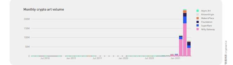 1.1藝術品類截止2021年4月19日,NFT六大加密藝術平臺SuperRare、MakersPlace、KnownOrigin、AsyncArt、Foundation和NiftyGateway,共售出190,665件藝術品,總市值達550,039,020.92美元。