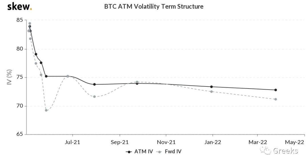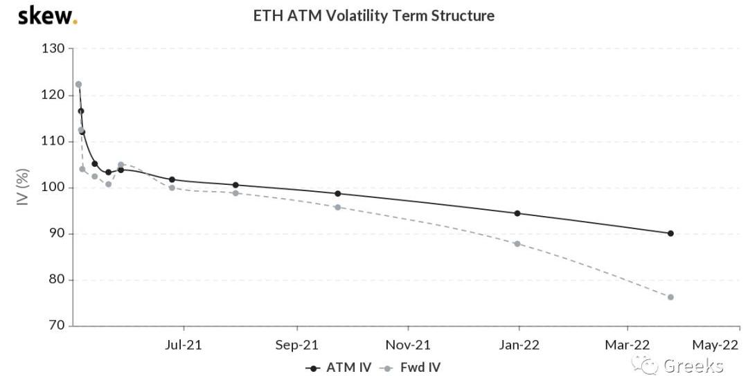 播報數據由Greeks.live和Skew.com提供。以太坊在突破3000美元后,氣勢如虹,最高一度沖破3500美元。以太坊期權當日成交16億美元,幾乎是比特幣期權成交量的兩倍,而這是以太坊期權單日成交量首次超過比特幣,可以說這是以太坊期權的里程碑。期權成交量8.79億美元,期權持倉量為100億美元。10d79%30d67%90d78%1Y68%各標準化期限隱含波動率:今日:1m76%,3m74%,6m74%,DVol87%5/3:1m67%,3m67%,6m68%,DVol77%比特幣價格反彈暫時告一段落,晚間短時跳水,全期限IV上升。整個市場的風向標是以太坊,在以太坊沖高回落的時候,本就不強勢的比特幣難免下跌,目前IV下買一個平值期權做動態對沖等待行情是不錯的選擇。