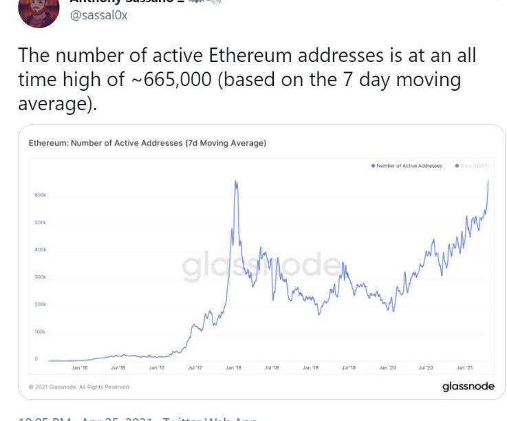 近期以太坊上的數據表現也相當不錯,EthHub聯合創始人AnthonySassano發布推特表示,據Glassnode數據顯示,以太坊活躍地址數量處于歷史高位,約為665,000個。