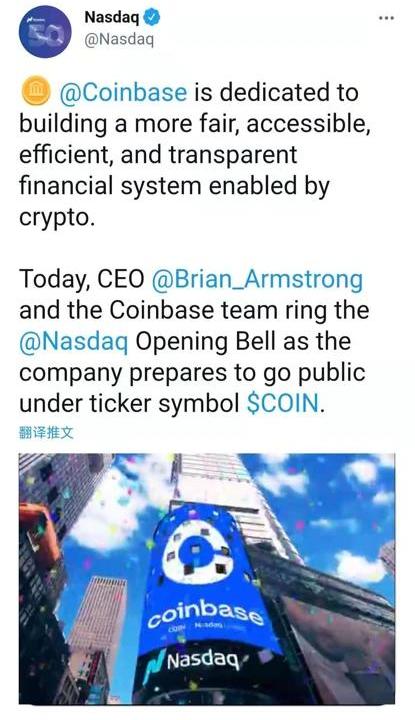 XRP/HKD-6.96%全球第一家數字貨幣交易所Coinbase在納斯達克上市,發行價為250美元,開盤報價381美元,盤中最高上漲至421美元,市值一度達到1120億美元,首日收漲31.31%,當天在美股市場成交額僅次于特斯拉。全球許多加密貨幣投資者將4月14日視為數字資產領域的分水嶺,這是加密貨幣史上的里程碑事件。COIN在傳統金融領域的首次亮相被認為是加密貨幣行業邁出的重要一步,主要是因為它為投資者提供了間接接觸加密貨幣的機會。殼牌公司的區塊鏈項目項目總監JellePol表示,Coinbase的直接上市是對那些仍然堅持認為“關于加密貨幣的一切都是不好的”人的有趣的警鐘。“ThankyouSatoshi,whoeveryouare.”上市前幾個小時,Coinbase前聯合創始人FredEhrsam發布這條推特,感謝中本聰。創始人兼CEOBrianArmstrong也向中本聰致敬,他在Coinbase上市招股書里提到了中本聰,并附上了中本聰錢包的地址。