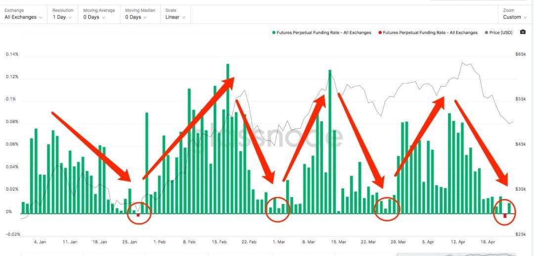 如上圖,我們可以看到,從23號之后,截止到北京時間25號23點,一共有約1.8W枚BTC凈流出了交易所,這個數字是遠大于流入交易所的大餅數量。沒有了拋壓,又有持續不斷的幣被提走,我們大概率是到了底部區間。四、資金費率短暫進入負數,拉升沒有阻礙