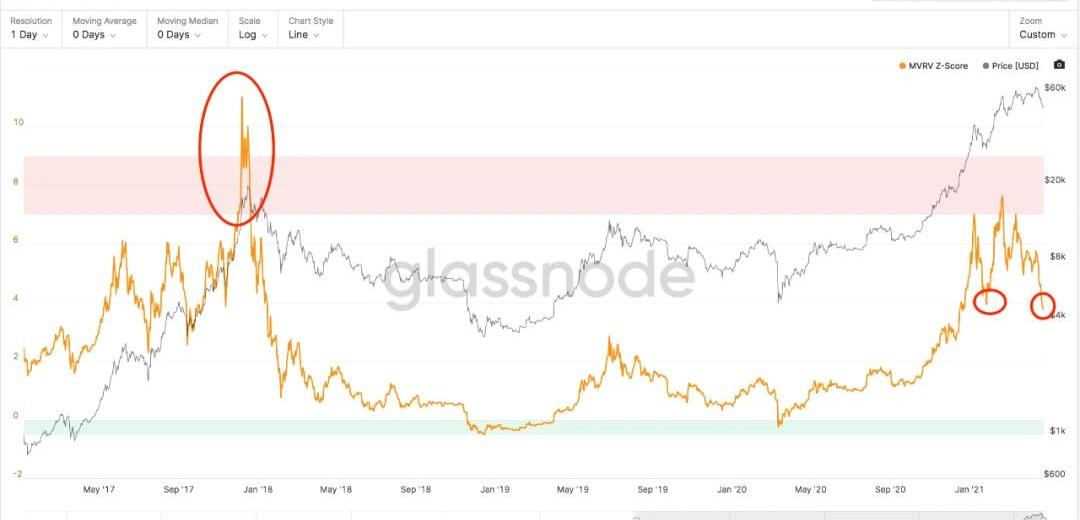 MarketValuetoRealizedValue(MVRV)是用來衡量BTC目前市值是超過或者低估其公允價值的指標。當進入如下圖紅色區域時,則說明我們進入了頂部區域,當進入綠色區域時,則說明BTC被低估,是買入好時機。