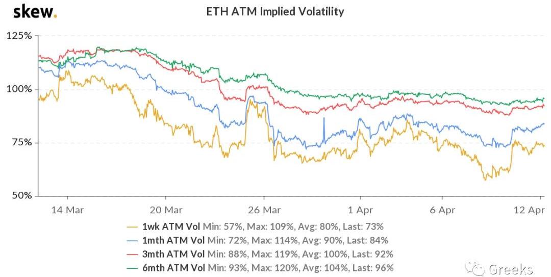 以太坊今日期權成交量1.11億美元,持倉量33億美元。10d90%30d80%90d110%1Y91%各標準化期限IV:今日:1m84%,3m92%,6m96%4/11:1m74%,3m88%,6m92%以太坊在歷史新高附近橫盤,以太坊的IV變化必然是要相對比特幣更明顯的,如果ETH的DVol出現,必然會是一個波動性較高的品種。