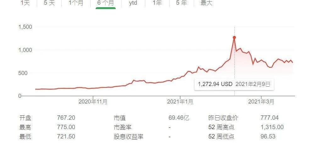 比特幣是一群服侍著智慧女神的黃蜂,它吸食真理之火,藏在加密能量之墻后,以指數型的速度變得越來越智能、越來越快、越來越強”。MicroStrategy曾稱短期內并不打算賣出比特幣,準備一直持有100年。塞勒也表示,投資比特幣的決定是公司內部眾多人員討論一致決定的,這是一種公司戰略,而不是簡單押注,在后續也會考慮購買更多比特幣這類有意義的資產。因此,Microstrategy就這樣開始了購置比特幣之路。2020年8月11日,MicroStrategy宣布購入了21,454枚比特幣,耗資2.5億美金;2020年9月14日,MicroStrategy再次宣布,購入了16,796枚比特幣,耗資1.75億美金;2020年11月4日,MicroStrategy宣布購入2,574枚比特幣,耗資0.5億美金;2020年12月21日,MicroStrategy宣布買入了29,646枚比特幣,耗資6.5億美金;……當然,購買比特幣也給MicroStrategy帶來了不小的收益。除了比特幣自身的誘人漲幅之外,還有此消息放出后帶來的股價上升。從去年開始,股價從買入比特幣前的在120美金左右,到現在(截至3月23日)1272.94美金的歷史新高。