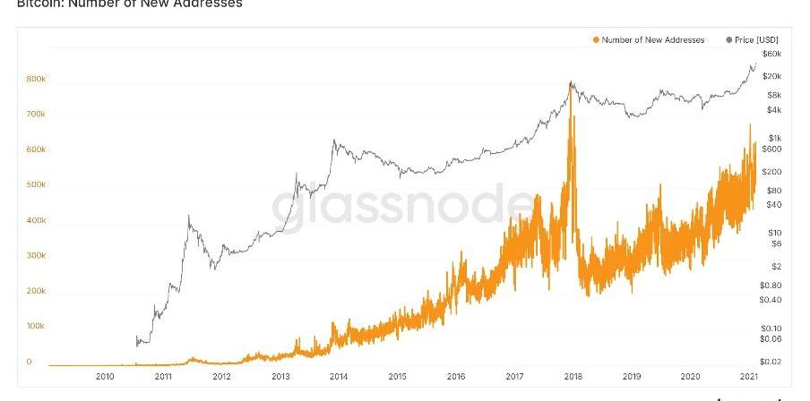 根據Glassnode的數據,在2017年牛市期間,有大量的新地址加入比特幣網絡,形成一個非常龐大的采納浪潮。然而,在經歷加密寒冬后數據有所回落,不過現在我們可以看見采納數字已經恢復,每天平均大約有56萬個新地址連接到比特幣網絡。