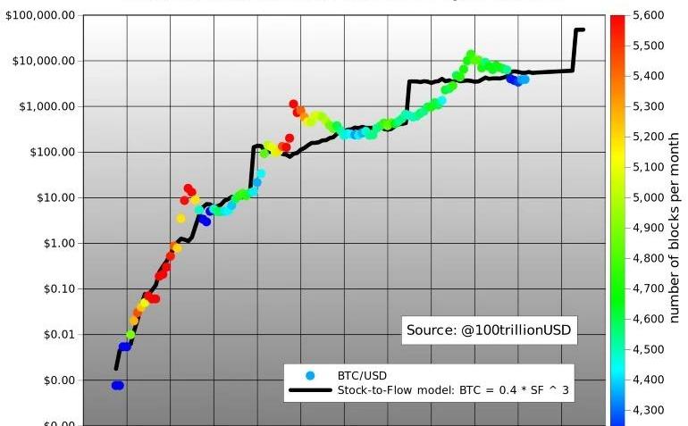 在PlanB的2019著名文章《ModelingBitcoinValuewithScarcity》,作者基于以下假設建立了知名的“S2F”比特幣估值模型:比特幣像黃金和白銀一樣稀缺比貴金屬更不可偽造高產出成本可無限分割單位價值高易于貯藏,甚至隨著時間幾乎0折損。因為賬本分布式會導致BTC“永久存在”stock-to-flow模型是是用來衡量稀缺性的指標,它通過將稀缺物品的存量跟未來一段時間內的增量進行對比,S2F越高,說明新增越慢,物品越稀缺。對于普通商品來說,要得到較高的S2F幾乎是不可能的,因為只要有人囤積它們,價格就會上升,導致產量上升,價格再次下跌。很難逃離這個陷阱。而BTC因為供應是固定的。新比特幣只通過新區塊產生。當礦工發現能滿足有效區塊所需要PoW哈希時,大約每10分鐘產生一個新區塊。因此BTC逃離了S2F陷阱,與黃金白銀一樣具備通過S2F建立價格模型的可能性。最終PlanB生成了下面這張知名的圖: