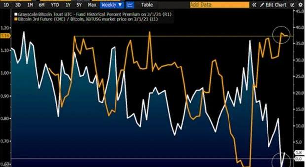 灰度比特幣信托基金溢價的急劇下降通常標志著比特幣探底。在加拿大發行比特幣交易所交易基金之后,美國開放比特幣交易所交易基金的可能性越來越高,這給信托價格增加了壓力,但BloombergIntelligence認為維持上升的趨勢是更可能的結果。套利者的喜悅——比特幣GBTC與期貨。在2月結束時,灰度比特幣信托基金與2020年12月芝商所交易的期貨的極端價格差異約為20%,我們認為這是對比特幣來說是個好事。下圖描繪了灰度比特幣信托基金以有史以來最大的折扣與滾動期貨并存的比特幣基礎價格并置情況。以這樣的折扣購買GBTC,表示比特幣實際價格應該接近43,000美元,而2020年12月的芝商所期貨結算價為53,250美元。費用和滑點會彌補實際20%的差距,但對于比特幣長期投資者來說,顯然可以簡單地對沖部分期貨持有量并鎖定利潤。下圖:灰度比特幣信托基金折扣vs.期貨溢價。