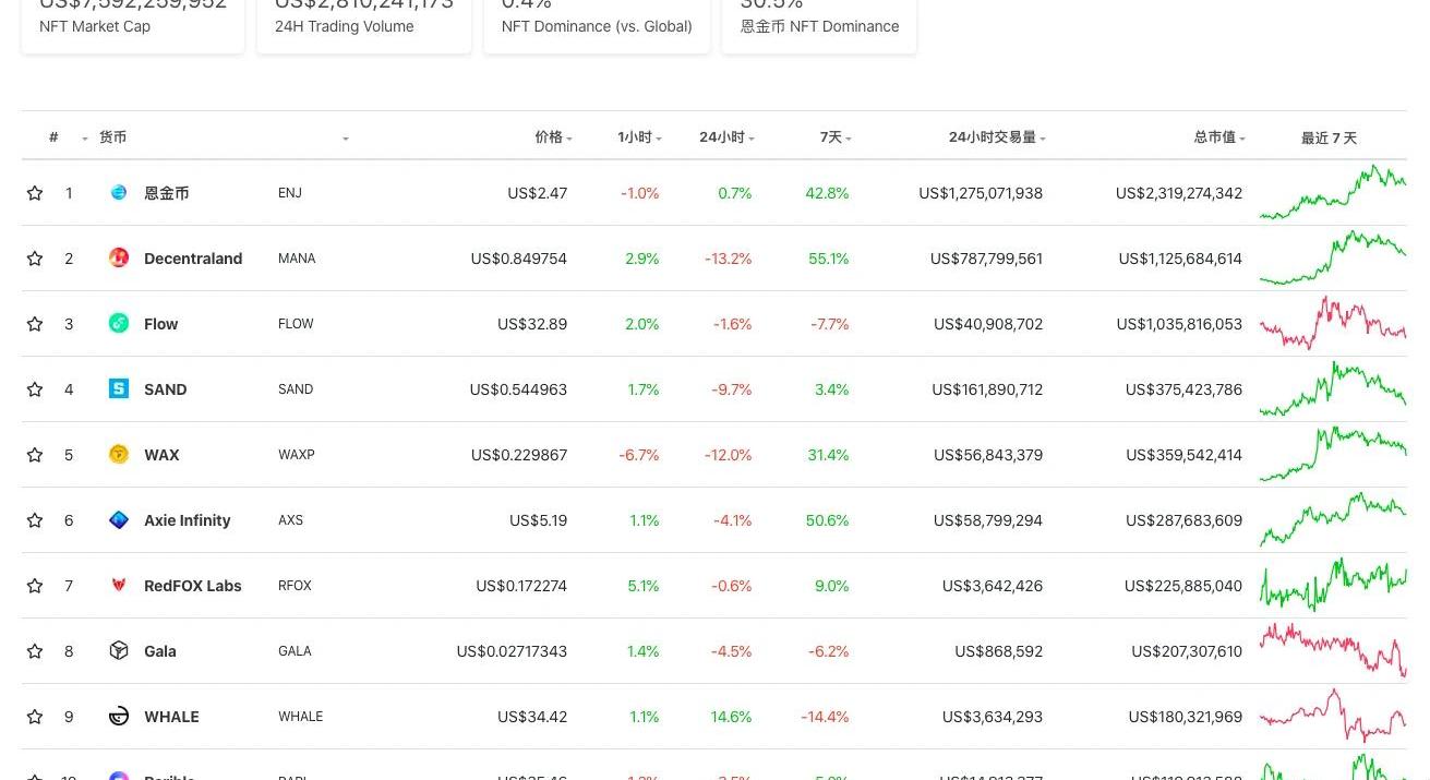 NFT作品:《Everydays:TheFirst5000Days》NFT交易市場的火爆帶動了NFT概念幣的上漲,ENJ、CHZ等代幣均在近期出現不同程度暴漲。與此同時,“NFT”一詞在谷歌上的搜索量達歷史新高。遺憾的是,NFT的火爆與大多數投資者無關,因為NFT賽道相對較新,大部分人尚不知NFT為何物,更別提如何參與NFT投資。簡單來說,NFT也是一種數字資產,但它與比特幣、以太坊等不同,具有唯一性,不可相互替代。目前大多數NFT基于以太坊ERC-721和ERC-1155標準發行,近期也出現了Flow等NFT公鏈,專注于NFT資產的發行和流通。究竟該如何參與NFT盛宴呢?本文梳理了目前主要的幾種方式,供大家參考。1.投資NFT代幣對于新手玩家來說,購買NFT概念幣是最簡單的投資方式。據CoinGecko統計,截至3月17日,共有超過100個NTF代幣,這些代幣的總市值接近76億美元,24小時成交量達28.1億美元。