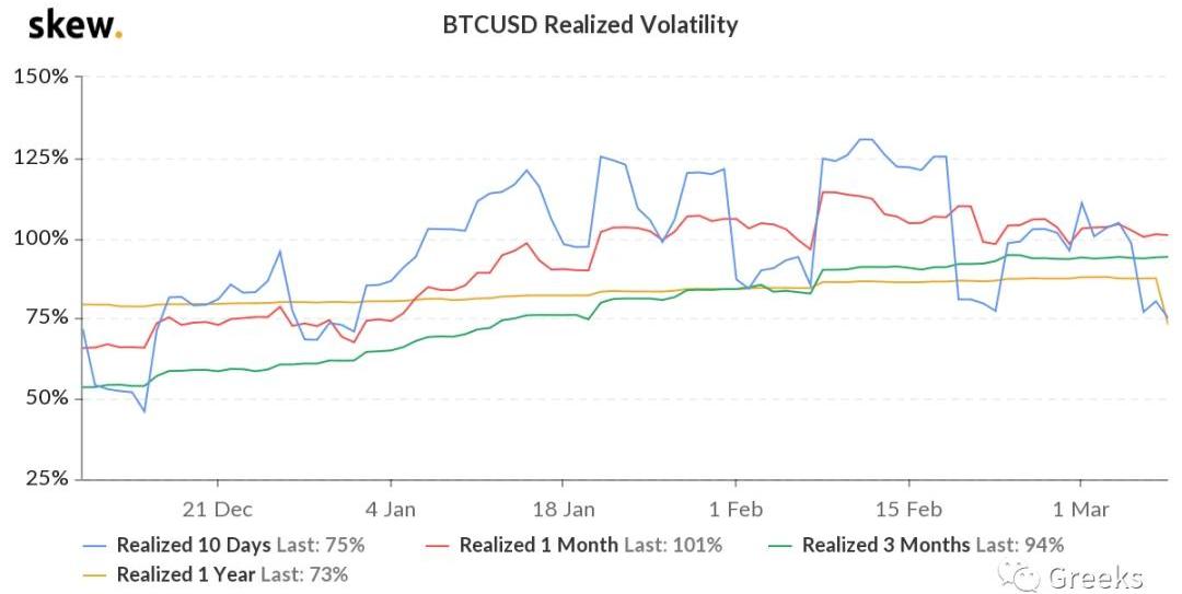 期權成交量5.31億美元,期權持倉量為94億美元。各標準化期限隱含波動率:今日:1m94%,3m97%,6m94%3/8:1m96%,3m100%,6m97%比特幣價格重回53500美元,多方重新掌握主動權,各期限IV小幅下降。今天有個很有趣的現象,因為RV計算取一年周期參數為360日,所以現在的1YRV剔除了312的數據,導致1YRV暴降至73%。