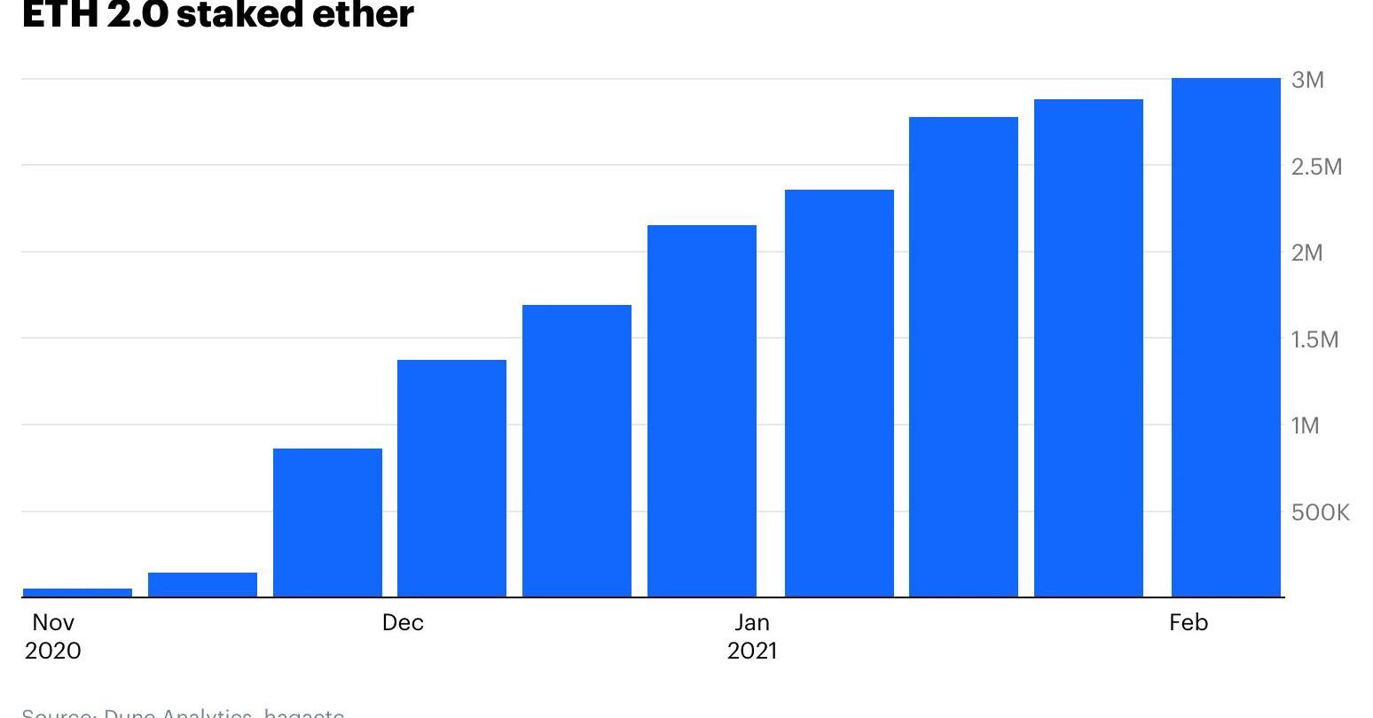以太坊經濟也引起了主要金融機構的關注。在很大程度上,由于穩定幣作為交易所和DeFi協議之間發送價值的一種非波動性方法而發揮作用,以太坊區塊鏈已經成為最受歡迎的美元支付工具之一。2020年,以太坊處理了價值8740億美元的支付,與Zelle和貝寶等主要面向消費者的系統競爭,盡管它仍遠低于聯邦快遞等中央銀行支付系統處理的金額。2020年12月,Visa宣布將其6000萬商戶的全球支付網絡與美穩定幣USDC連接起來。貝寶最近也為其龐大的美國用戶群提供了有限的ETH交易,并計劃將該功能擴展到全球3.25億用戶。該公司首席執行官DanielSchulman在2021年的財報電話會議上表示:“我們都知道,當前的金融體系已經過時,我們可以預見在未來交易將在幾秒內完成,而不是幾天。我們正在大力投資我們新的加密貨幣區塊鏈和數字貨幣業務部門,以幫助塑造這個更具包容性的未來。”與此同時,機構投資者也開始進入以太坊。幫助投資者通過傳統券商獲得以太坊的灰度以太坊信托在過去一年出現了大幅增長。該基金目前持有300萬個ETH,價值超過40億美元。