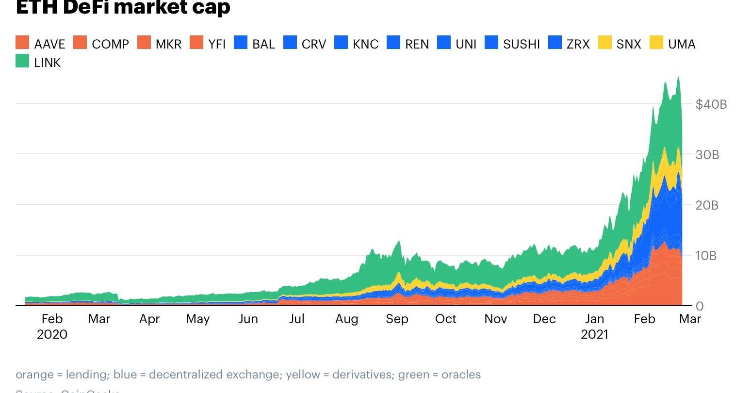 以太坊經濟總市值穩定幣通過將其價值與美元等儲備資產掛鉤來降低波動性,它們是ETH經濟中最有前途和增長最快的領域之一。它們已被廣泛采用,作為交易所之間進行支付的穩定媒介。截至2021年2月,以太坊區塊鏈上穩定幣的總價值已經超過300億美元:
