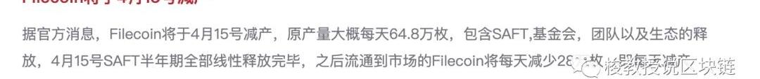 根據Filecoin的公告,除了6月期的全部釋放后,基金會已經團隊還有生態的釋放大概減少120000枚Fil一天,即市場上4月16號,當天就少流通了280000枚Fil,然后按照它公告每天減產43.2%,這大概一個月后就一天產出1個Fil了吧,寫這個公告的人要么英文不行,要么語文不行,反正業務水平太low了。正常理解應該是,6月的saft全部釋放完了,然后除了這一塊基金會和團隊以及生態釋放的那部分減少了,一天的產量從半年后即4月15號的64.8w減少28w變成36.8w而已。而現在其實10月15號第一天挖礦的產出的Fil還有一部分沒釋放完,所以挖礦產出到現在也只是144,150枚Fil,而到了4月15號后每天挖礦的產出是172,980枚Fil這部分就開始是固定產出了,因為每天都有一批180天釋放的挖礦產出到期了。回歸整體,目前Fil的情況是怎么樣的。