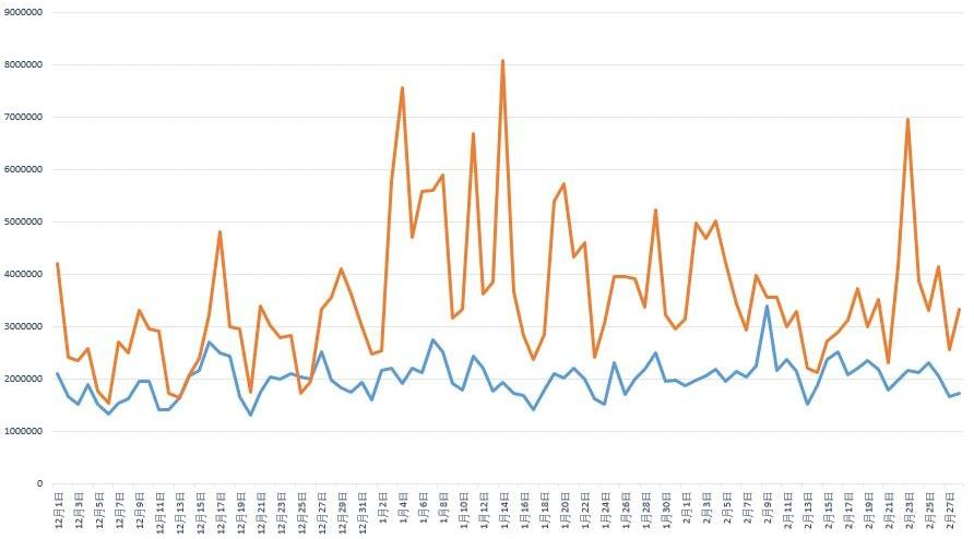 隨著比特幣在本周開啟下探,以太坊和DeFi代幣也未能獨善其身。此前強勢上行的DeFi協議代幣在本周集體熄火,以太坊上DeFi協議的總鎖倉量也下降至485億美元,較上周同期下降11.88%。此外,市場下行也導致DeFi協議中不少抵押頭寸被清算。在市場下行幅度較大的2月23日,僅Compound協議上的清算金額就達到8639萬美元。鏈上數據比特幣上周的鏈上交易量1407.35萬BTC,環比回落9.27%;而以太坊的鏈上交易量為2835.17萬ETH,環比上升33.03%。