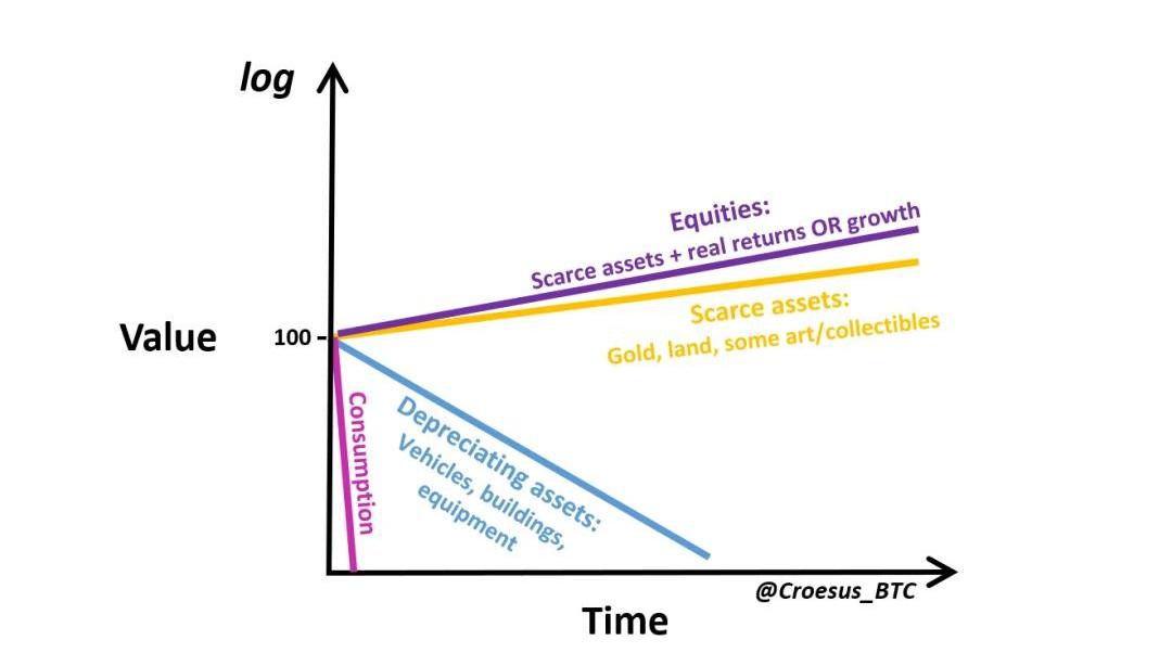 注釋:股票:稀缺資產+實際收益OR增長稀缺資產:黃金、土地、一些藝術品/收藏品。貶值資產:車輛、建筑物、設備。消費法幣:因設計而衰敗