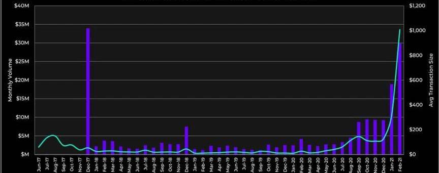 許多業內大咖也開始與NFT受眾積極互動,比如NBA達拉斯獨行俠隊老板、億萬富翁馬克·庫班、足球運動員梅蘇特·厄齊爾、以及美國模特、影星林賽·羅韓等。最近,全球知名拍賣行佳士得宣布將拍賣由藝術家beeple創作的第一個純數字藝術品,這也是大型拍賣行首次為純數字藝術作品提供拍賣支持。以太坊上NFT交易額屢創新高,但也擁堵不堪