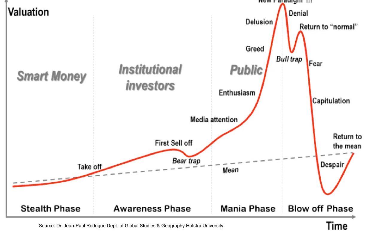 這張圖基本上描述了一項新興技術或產品被采用的過程,膨脹的預期如何推動價格過高,以及在拋售和脫離期之后,如何以漸進的方式繼續增長。很多時候,當評論家說到“泡沫“時,是因為他們期待著大規模的拋售,而且往往是之前事件的完全重復。但我們在這篇文章中想強調的是,市場并不是簡單的上下波動——相反,它們會不斷發展。比如下圖從心理學的角度描述了泡沫的運作。