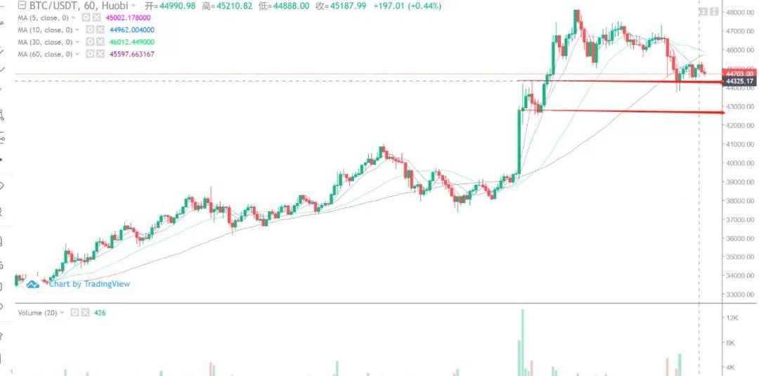 BTC4H周期中樞錨定位置第一回撤線,44300左右;第二回撤線42600左右;日線縮量調整,風險系數很小,安心持倉過年。ETH行情分析
