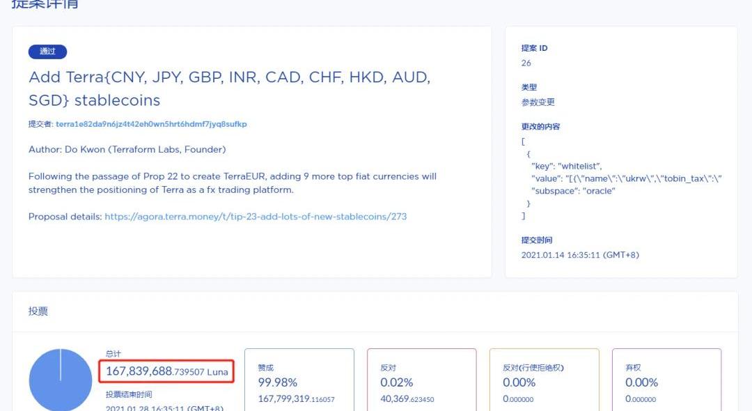 看過發展情況之后,我們具體來看一下Terra穩定幣的實現原理。Terra是基于Cosmos框架搭建的一個區塊鏈協議,是一條單獨的鏈,在這條鏈上Terra開發搭建了一個穩定幣網絡,發行了多種法定貨幣的錨定幣。Terra發行的穩定幣是算法穩定幣,背后并沒有BTC、ETH或者美元類似的支撐資產,而是由Terra的系統代幣LUNA進行背書。目前Terra發行量較大的穩定幣是UST、KRT、SDT和MNT,其中UST是美元穩定幣,KRT是韓元穩定幣、SDT是SDR穩定幣,MNT是蒙古圖格里克穩定幣。Terra系統通過套利機制調節穩定幣價格,使穩定幣保持錨定,舉例如下:當1枚KRT價格<1KRW,礦工向系統發送一枚KRT并獲得與1KRW等值的Luna代幣,此時系統的KRT供應量減少、價格上升逐漸趨近等值韓元;當1枚KRT價格>1KRW,礦工向系統發送與1KRW等值的Luna代幣并獲得1KRT,此時系統的KRT供應量增加、價格下降,逐漸趨近等值韓元。Terra生態內礦工非常重要,穩定幣由礦工質押原生代幣LUNA生成,同時當價格脫錨時,也需要礦工承擔短期的波動風險來鑄造/銷毀相應代幣,來平穩價格。礦工保護網絡安全的同時還承擔平穩價格的功能,Terra為礦工設計了確定性收益來激勵礦工,讓礦工有動力去為網絡正常運行而承擔風險。Terra內發生的每筆交易將會被收取0.1%到1%的費用,上限為1TerraSDR,費用將分配給參與Staking的用戶。獎勵會隨著交易量的增加而增加。同時Terra內還有鑄幣稅,當TERRA的需求增加時,系統會鑄造并出售TERRA,獲取LUNA,這就是鑄幣稅,礦工在承擔風險的同時,按Staking比例獲得獎勵。系統會燃燒一部分賺取的LUNA,使挖礦能力更加稀缺。鑄幣稅的剩余部分歸基金會所有,以提供財政激勵。我們可以看到Terra的穩定幣系統是以LUNA為背書的,當LUNA價格大幅波動時,穩定幣可能會出現脫錨情況,這也是市場上對Terra體系的質疑所在。但隨著Terra使用人數、交易量的不斷增長,用戶基礎不斷穩固,將會提升Terra體系的抗風險能力。治理參與度較低是很多項目想要解決的難題,但觀察Terra的提案,可以發現多個提案的投票數量都超過1億枚,目前系統內總質押數量為3億枚,這說明每個提案都有大量的用戶參與投票。