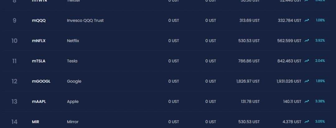 MirrorProtocol是一個合成資產平臺,通過MirrorProtocol可以鑄造、交易股票、期貨、交易所基金等資產的合成代幣。用戶通過MirrorProtocol可以直接交易全球各種頭部資產,目前已經上線了14個合成資產。