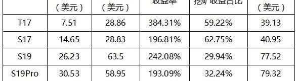 數據來源:veryhash.com2020年11月~2021年1月的螞蟻礦機綜合收益走勢呈上升狀態,1月第一周增速大幅提高,第二周持穩,第三周呈下降趨勢。收益率最高的是T17,最低的是S19Pro。挖礦收益占比最大的是S17,最小的是S19。因上一季度礦機價格跌幅較大,故僅對比兩季度挖礦收益,T17、S17、S19、S19Pro的挖礦收益率分別提高205.52%、100.64%、50.47%、47.61%。