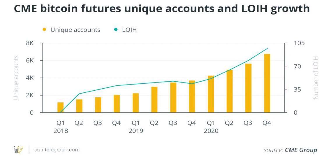 去年,加密衍生品經歷了一個巨大的增長階段,比特幣期權的未平倉頭寸在100天內翻了3倍,在12月31日達到68億美元的年內高點,然后在2021年1月初的牛市行情中進一步增長,于1月7日達到105億美元的歷史高點。盡管這種增長包括了散戶投資者的興趣增加,但有幾個指標表明,這一增長主要得益于機構投資者的參與。芝加哥商品交易所是機構投資者通過比特幣期貨和期權接觸數字資產的最重要交易所之一。該平臺報告稱,2020年比特幣的日均交易量同比增長114%,這使得芝加哥商品交易所的日均未平倉量增加了252%,活躍賬戶也上升到6700個,同比增長84%。如下圖所示,機構興趣的主要指標——即未平倉合約的持有人數量在12月增長至110個,創下歷史新高。
