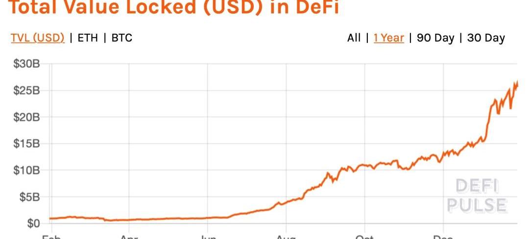 XRP/HKD-2.32%本文作者為NewBloc策略分析師Barry,5年外匯黃金市場交易經歷。在1月19號,ETH創出了1440美元的記錄,同時在以太坊鏈上的DeFi項目也受到了市場上的青睞。自2020年5月以來,圍繞DeFi的話題正不斷增加,在不到1年的時間里資產在DeFi中的總鎖倉價值,足足翻了25倍,其火爆程度令人驚嘆。