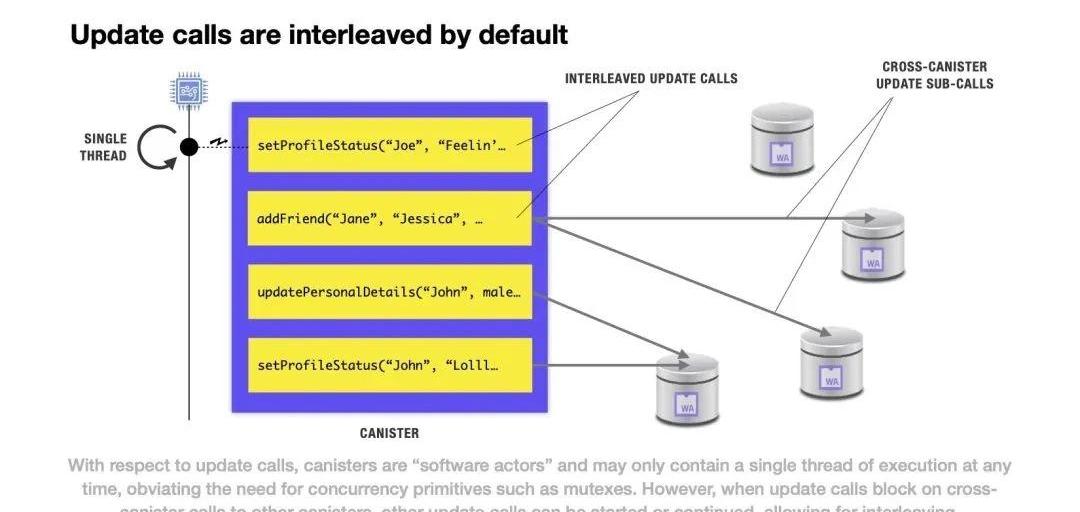 開發人員保留數據的方式時互聯網計算機最酷的功能情之一。開發人員不必考慮持久性問題,他們只需編寫代碼,持久性就會自動發生。這稱為正交持久性。這是因為互聯網計算機會保留容器中的內存數據頁。你可能想知道這一切如何工作。對于可以使內存數據頁發生變化的更新調用來說,容器是軟件執行者。這意味著在任何給定時間,容器內只能有一個執行線程。