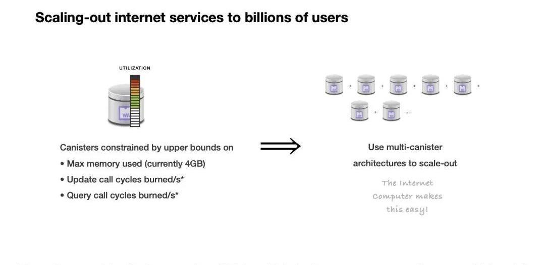 現在來談談互聯網計算機服務的可擴展性。不同類型的容器都有各自的容量上限。例如,由于WebAssembly實現的限制,一個容器只能存儲4GB的內存。因此,當我們要創建可擴展到數十億用戶的互聯網服務時,我們必須使用多容器架構。