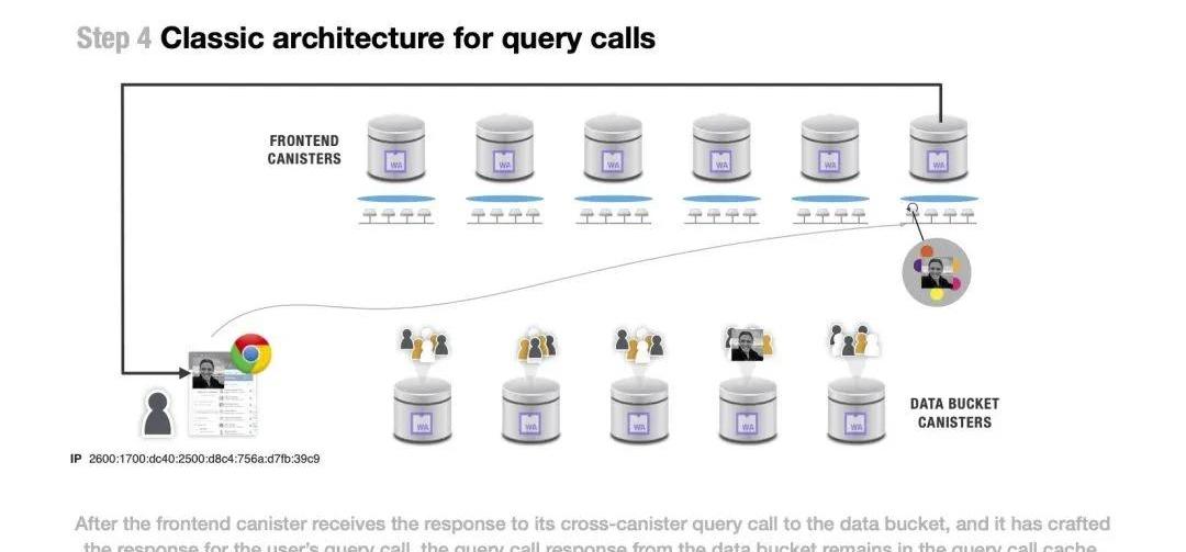 互聯網計算機提供了一些有趣的功能,可以將終端用戶錨定到前端容器,比如允許通過NNS將域名映射到多個前端容器上。當終端用戶希望解析這樣的域名時,互聯網計算機將查看托管前端容器的所有子網中所有副本節點的總數,并返回最接近的副本節點的IP地址。這導致終端用戶會在距離最近的副本上執行查詢調用,從而減少了固有的網絡延遲并改善了用戶體驗,在沒有內容分發網絡的情況下提供了邊緣計算的優勢。為了充分利用這個功能,我們需要一個涉及前端容器和后端數據桶容器的經典兩層結構。在此示例中,Web瀏覽器希望加載個人資料圖片。Step1,Web瀏覽器將映射到一個前端容器,它運行在具有附近節點的子網。然后,Web瀏覽器將提交查詢調用請求到附近的節點以檢索照片。Step2,前端容器將向保存照片的數據容器發出跨容器查詢調用請求。Step3,如果數據存儲容器返回的查詢調用響應涉及靜態內容(例如照片),則可以將數據存儲在緩存中。在此案例中,運行前端容器查詢調用的副本節點,可以將查詢調用的響應存儲到其查詢緩存中。