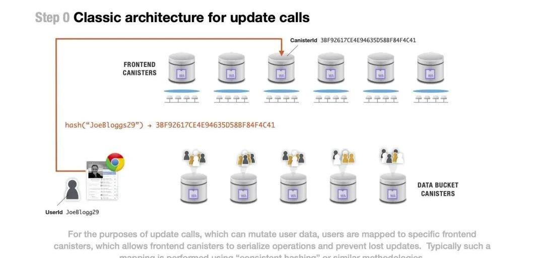 對于更新調用,經典兩層結構采用了不同的方法。必須序列化對用戶內容和數據的更新,以防止諸如更新丟失之類的問題。通常,會通過計算用戶hash值,將用戶映射到特定的前端容器來實現的。
