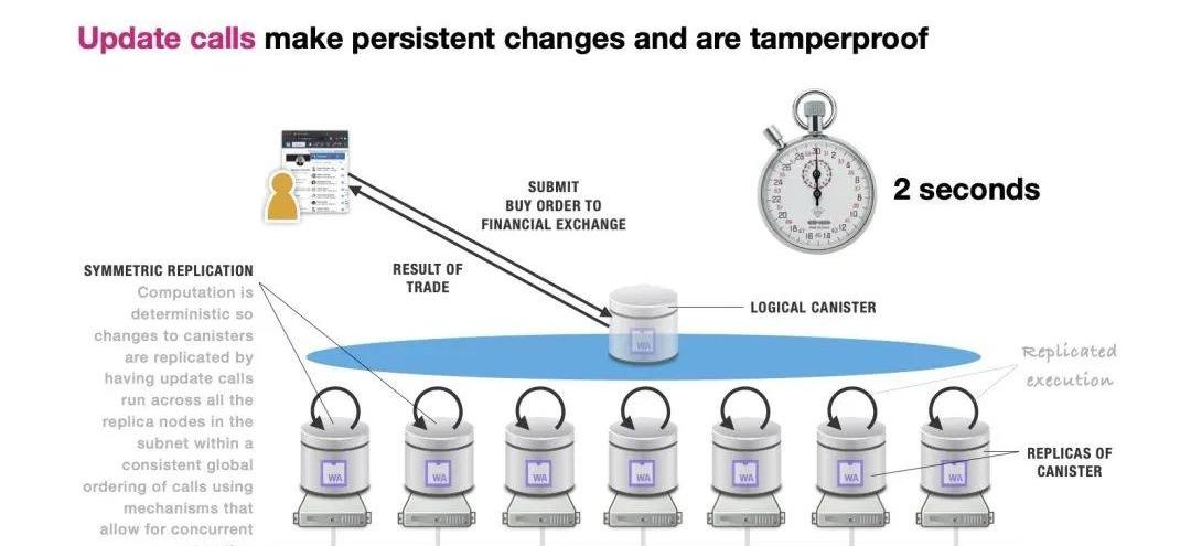 在互聯網計算機上,調用容器共享的函數有兩種方式:更新調用或查詢調用。本質區別在于,當你將函數作為更新調用進行調用時,其對容器內存中的數據所做的任何更改都將保留,而如果將函數作為查詢調用進行調用時,則其對內存的任何更改在運行后都將被丟棄。更新調用的更改是持久化的,并且它們是防篡改的,因為ICP區塊鏈計算機協議在子網的每個節點上都運行它們。如你所預期的,這些調用在一致的全局調用順序中,允許在完全確定的執行環境中并發執行。更新調用在兩秒內就可完成。