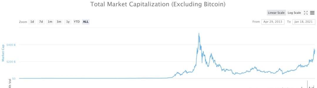 最近一周,隨著UNI\\SUSHI等DeFi幣持續大漲,比特幣市值占比從接近70%下滑至67%,山寨幣市值連續上漲,但還未突破2017年歷史新高,山寨幣牛市來了么?