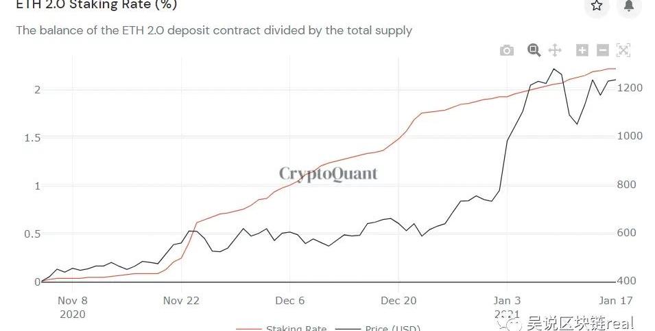 與交易所持有ETH數量下降相對的,是ETH2.0抵押率的上升,當前ETH2.0抵押率為2.22%,也就是說有2.22%的ETH供應量都被質押在ETH2.0存款合約中。交易所儲備量的下降,質押率的上升,將會使ETH流動性緊縮,而流動性的不足將會成為ETH價格長期上漲的動力。