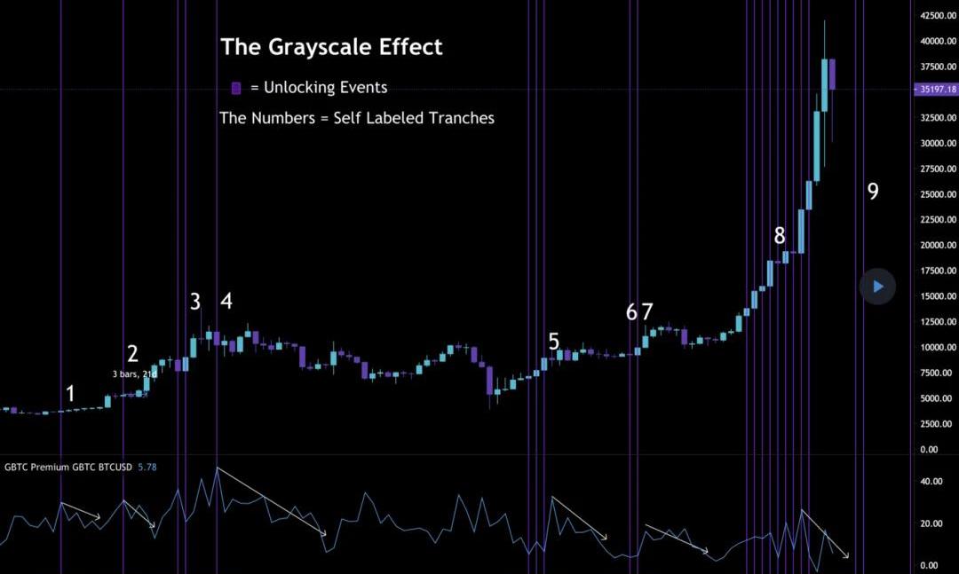 很明顯的是,這些解禁事件與價格大幅走高相吻合。現在,對于那些想知道這對GBTC溢價意味著什么,以及在該市場上新股卸貨時是什么樣子的人來說。下面是快速圖,總結一下GBTC股的解禁情況。注意圖中底部三分之一的指標,那是溢價。每次股票解禁后都會下降。所以如果你要玩GBTC這個,就在解禁前一周買入,解禁時賣出。