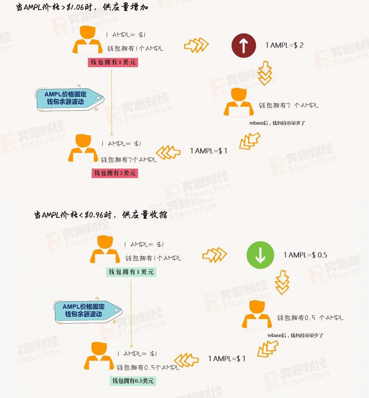 供應彈性的加密貨幣穩定幣價的方式依賴于市場集體需求心理,不僅受制于人性的貪婪與恐慌,更是借由金融投機來擴充市場規模。下面我們來進行簡單的分析和說明:假設按照當前市場價格,小明用1美元購買了1枚AMPL,當市場需求增加,刺激了AMPL的價格上漲,AMPL的價格變成了2美元,觸發rebase,按照比例,小明錢包中的AMPL變成了2枚,而AMPL價格回歸到1美元時,小明錢包的余額增加了1美元,但是這個過程小明什么都沒有做。反之,當市場需求下降,AMPL的價格下跌,錢包持幣量下降。