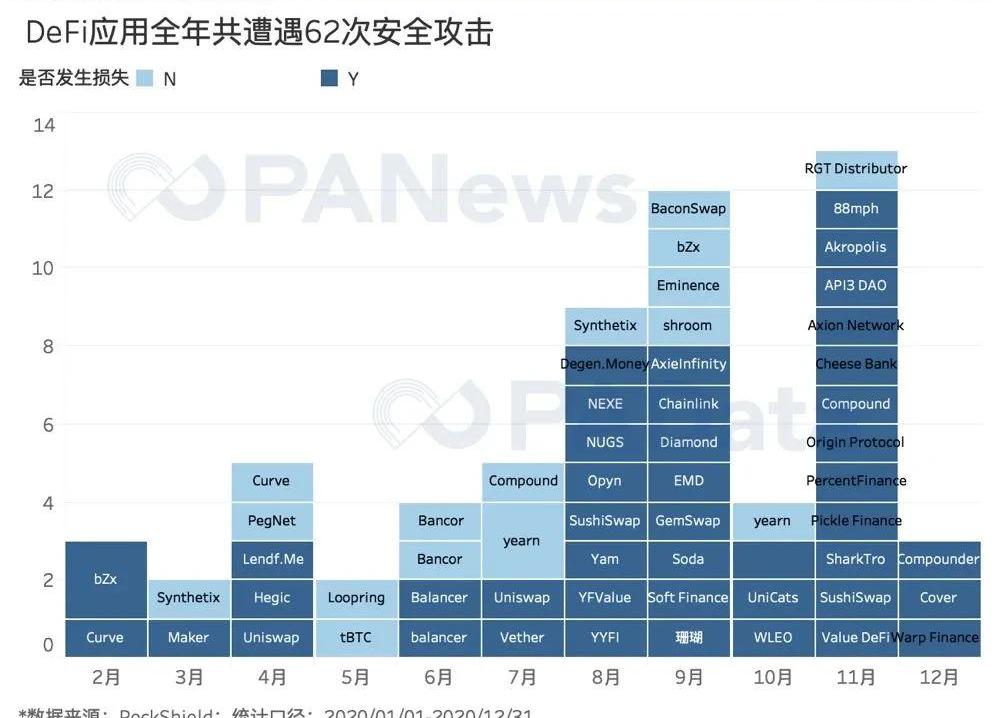 全年安全事件頻發與2020年“DeFiLego”玩法越來越多有關,項目組合導致系統性風險擴散,但這恰恰又是DeFi的潛力所在。2021年DeFi再進一步還需要更加安全的合約作為基礎。其他說明:參考PAData早前文章《數說風口上的DEX:流動性暴漲300%,“壽司大廚”吃相難看》。如果一起安全事件攻擊兩個或以上的DeFi協議,則按被攻擊的DeFi協議的數量計算安全事件數量。