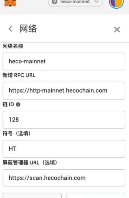 輸入火幣智能鏈Heco的參數:網絡名稱:heco-mainnetRPCURL:https://http-mainnet.hecochain.comID:128符號:HT屏蔽管理器URL:https://scan.hecochain.com