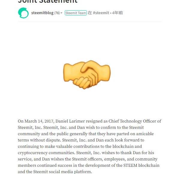 早期的BM2015年11月,在一次關于是否要調低交易費用的社區投票中,BM被大股東以7:4的投票結果擊敗了。或出于傷心,或處于憤怒,BM離開了比特股。2016年年初,BM和NedScott共同創立新項目Steem。后者是一個基于石墨烯技術的區塊鏈社交平臺,兩人達成一致,BM專攻技術,NedScott則擔任CEO。很快,新公司拿到22萬美元融資,并順利推出了STEEM代幣。就在大家以為Steem還在順利發展的時候,2017年3月,BM突然離開Steem,表示已與NedScott達成友好協議,同時他不再擔任該項目的股東。